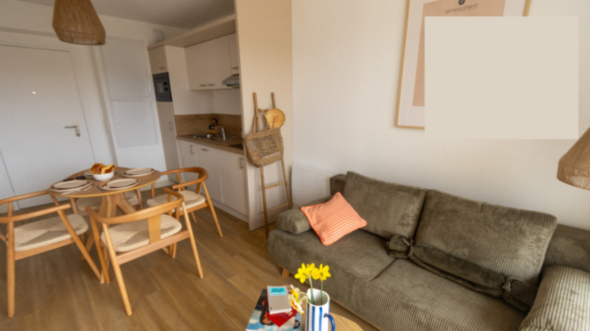Le Nid offre un espace optimisé et chaleureux, mêlant bois clair, teintes sable et touches végétales.